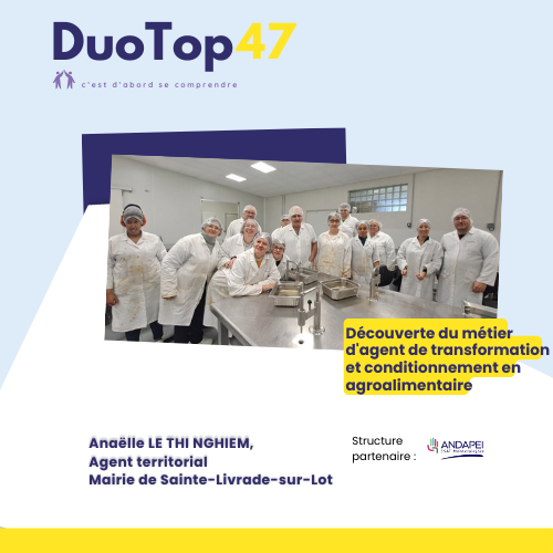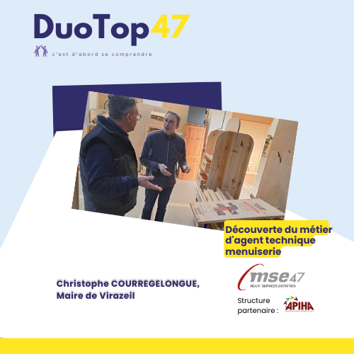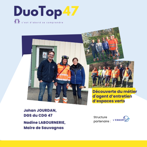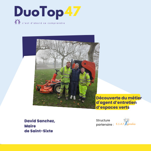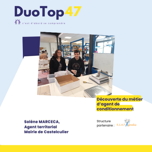De la même manière, le DuoTop47 a pour but de constituer des duos, sur une journée ou une demi-journée. Ce moment d’échange permettra à une personne en situation de handicap d’accueillir dans son quotidien, au travail ou sur son lieu de formation, un élu local ou un agent territorial.